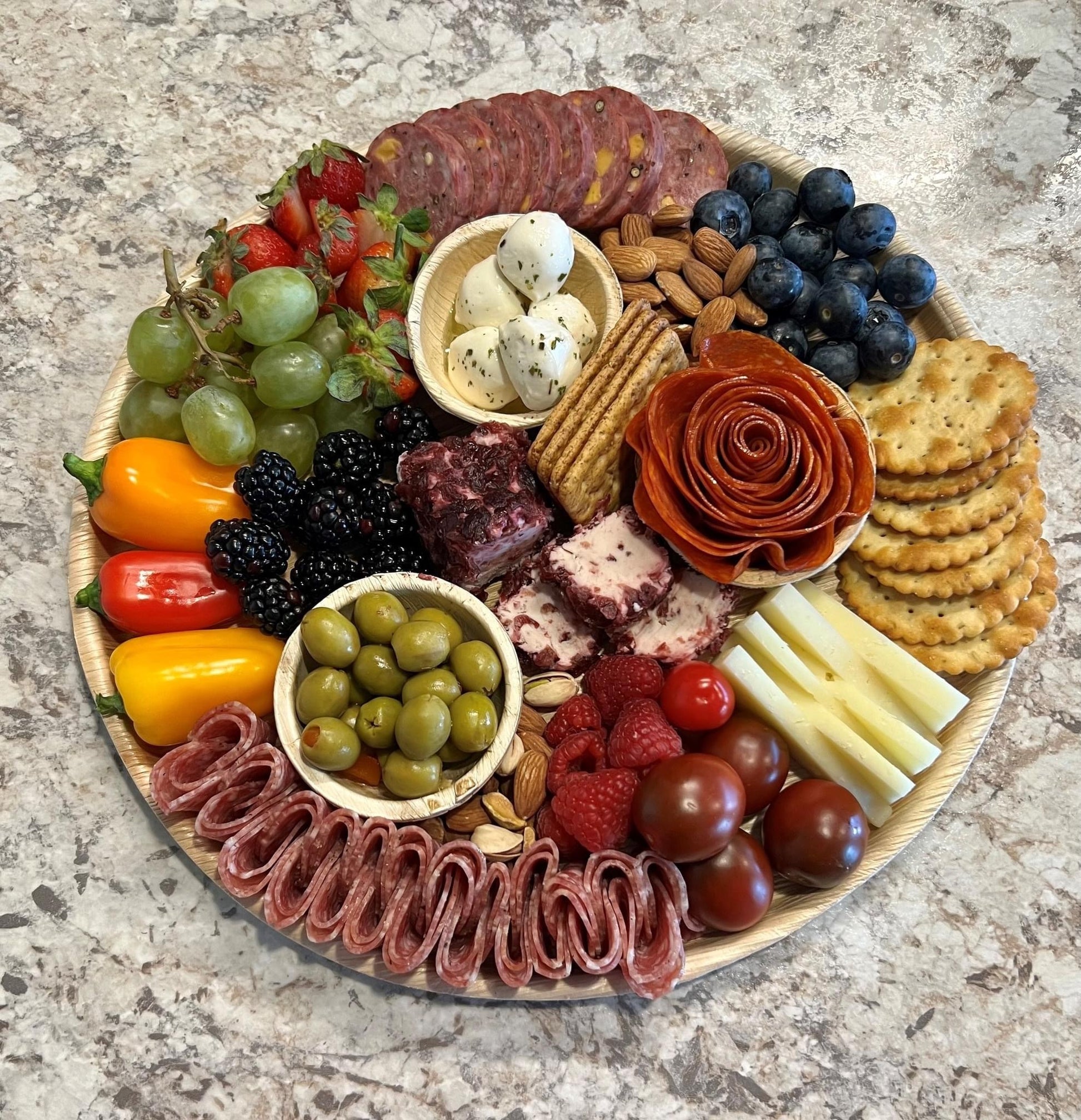- Fruits, spreads, nuts, olives and extra goodies